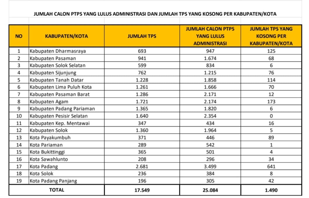 Andalaspos,Padang – Badan Pengawas Pemilihan Umum (Bawaslu) Provinsi Sumatera Barat , pertanggal 10 Januari 2024 sebanyak 25.084 pelamar dinyatakan lulus tahap administrasi rekrutmen Pengawas Tempat Pemungutan Suara (PTPS) di Wilayah Sumbar. Sementara jumlah PTPS yang akan diterima tahun ini sebanyak 17.549 orang.