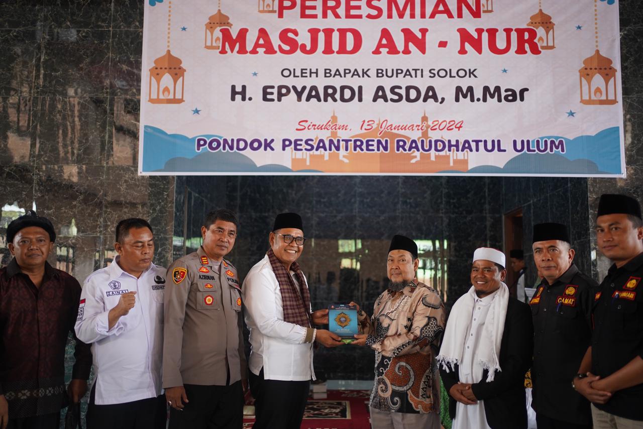 Andalaspos,Kab.Solok – Bupati Solok Capt.H.Epyardi Asda, M.Mar Dt. Sutan Majo Lelo meresmikan Mesjid An-Nur Pondok Pesantren Raudhatul Ulum Nagari Sirukam, Sabtu (13/1/2024).