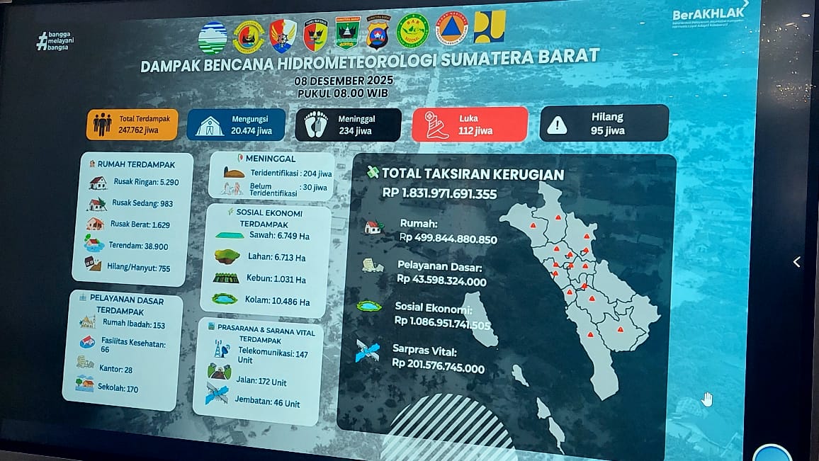 Data tersebut berasal dari laporan resmi Pemerintah Provinsi Sumatera Barat per 8 Desember 2025 pukul 08.00 WIB, yang mencatat sedikitnya 247.762 warga terdampak dengan tingkat kerusakan yang sangat luas dan berat.