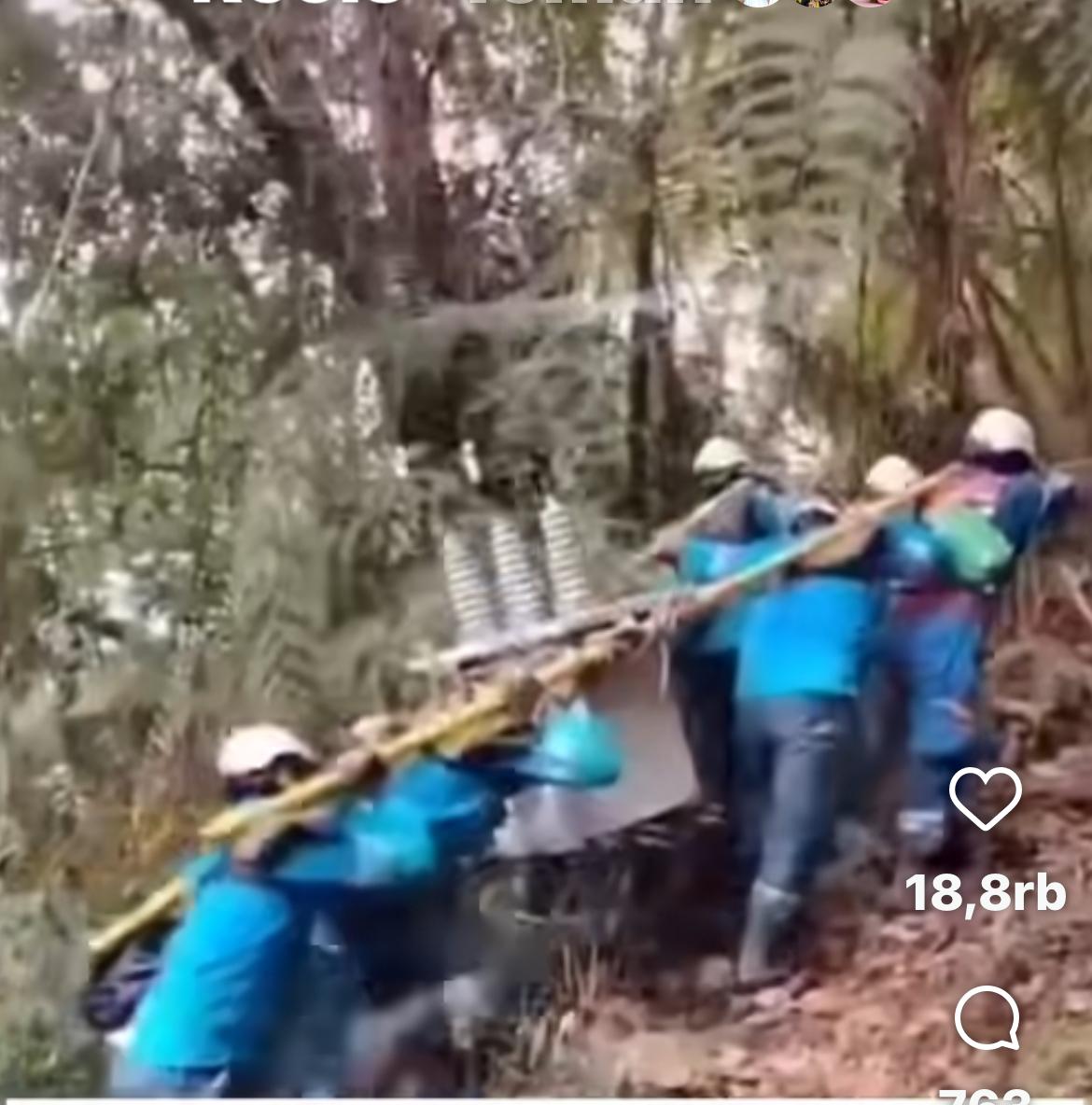 Para petugas PLN terlihat bahu-membahu. Mereka memikul trafo tersebut menggunakan bambu sebagai penyangga. Beratnya beban dan curamnya tanjakan menciptakan pemandangan perjuangan yang dramatis.