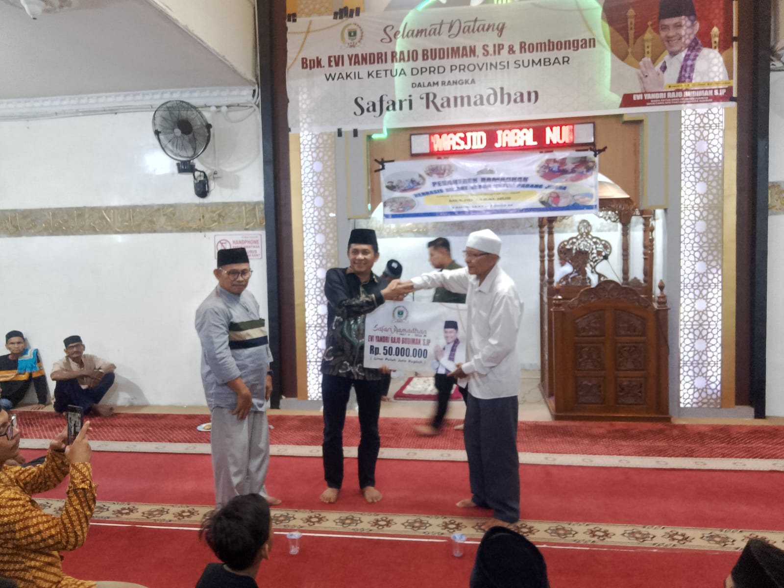 Saat safari ramadhan tersebut, Evi Yandri menyerahkan bantuan untuk masjid senilai Rp50 juta dari pemerintahan provinsi Sumbar.