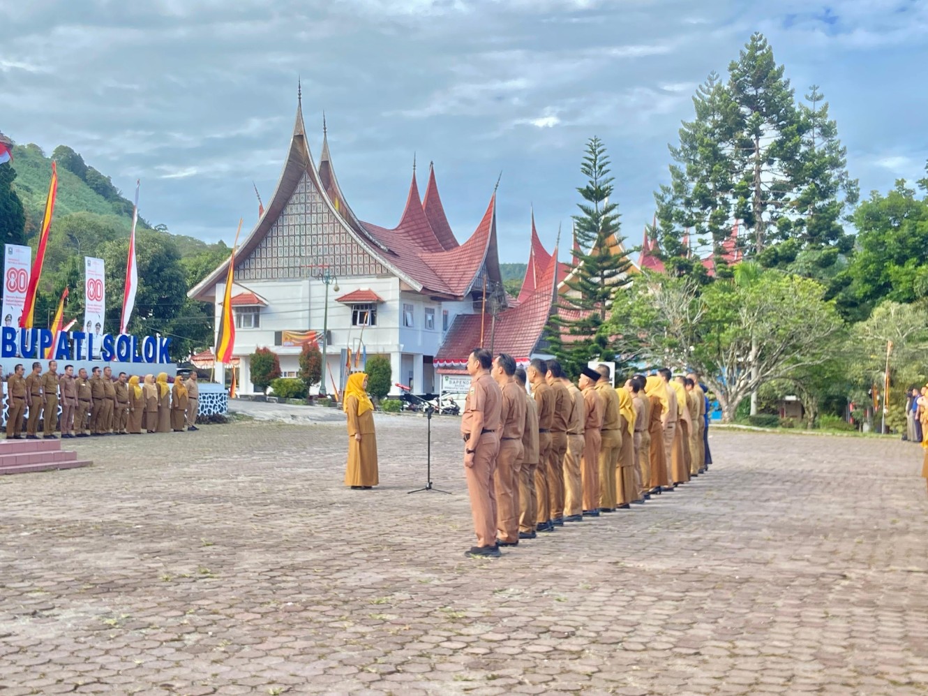 Andalaspos,Arosuka – Pemerintah Kabupaten Solok melaksanakan apel pagi pada Senin, 25 Agustus 2025 di Halaman Kantor Bupati Solok, Arosuka. Apel pagi ini di pimpin oleh Kepala Dinas Komunikasi dan Informatika Teta Midra. Kegiatan ini juga diikuti oleh Sekretaris Daerah Medison, Para Staf Ahli, Para Asisten Bupati serta Kepala OPD dan seluruh Aparatur Sipil Negara (ASN) serta tenaga honorer di lingkungan Pemerintah Kabupaten Solok.