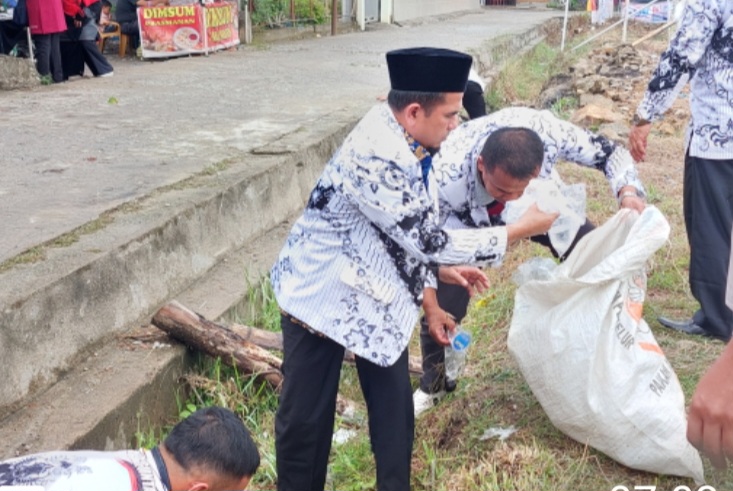 Andalaspos,Bukit Sundi (Diskominfo) – Dalam rangka memperingati Hari Ulang Tahun (HUT) PGRI ke-80 dan Hari Guru Nasional Tahun 2025, Wakil Bupati Solok, H. Candra, memimpin aksi bersih-bersih sampah di Lapangan Sepak Bola Bukit Sundi, Senin (17/11/2025). Aksi ini diikuti oleh seluruh peserta yang hadir, termasuk para guru, Babinsa, Danramil, Kapolsek, Camat Bukit Sundi Vice Febrianeldi, dan jajaran, serta Wali Nagari Muaro Paneh diikuti masyarakat sekitar.
