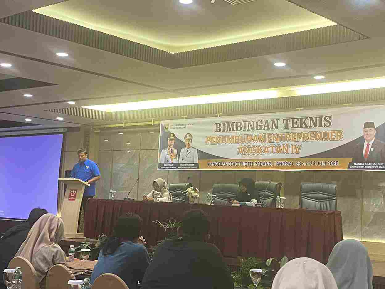 Padang, AndalasPos.com—Wakil Ketua DPRD Provinsi Sumatera Barat Nanda Satria diwakili Bendahara KNPI Sumbar Varel Oriano yang juga anggota DPRD Sumbar membuka Bimbingan Teknik (Bimtek) penumbuhan enterpreneur angkatan ke-IV tahun 2025 kegiatan atas pokir Nanda Satria digelar di pangeran hotel, pada Rabu (23/8/2025).