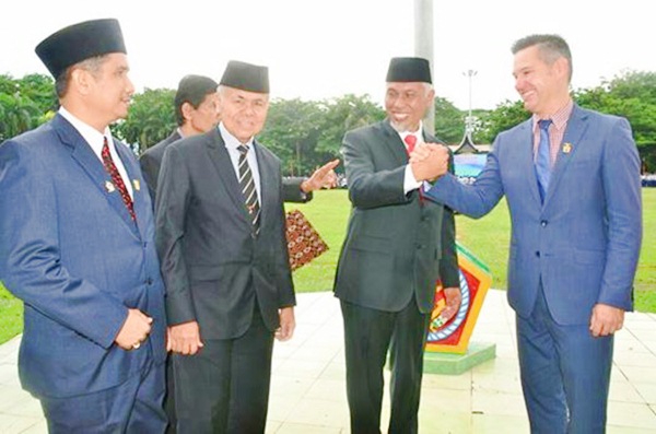 Padang AP– Walikota Fremantle, Australia, DR Brad Pettitt dinobatkan sebagai tamu kehormatan saat berkunjung ke Padang, 1-5 Mei 2017. Walikota Padang H. Mahyeldi Ansharullah Dt Marajo menyempatkan pin tamu kehormatan kepada Walikota Fremantle di sela upacara peringatan Hari Pendidikan Nasional 2017 di Lapangan Imam Bonjol Padang, Selasa (2/5).